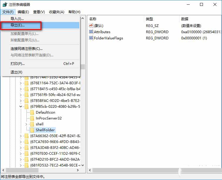 3、下面我们就可以修改{679f85cb-0220-4080-b29b-5540cc05aab6}\ShellFolder的注册表键值,但在修改之前,备份一下注册表是必须的。