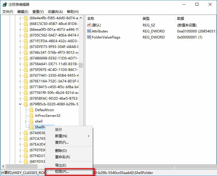 4、我们备份了{679f85cb-0220-4080-b29b-5540cc05aab6}\ShellFolder的注册表键值,现在再来修改ShellFolder的权限值(不修改ShellFolder的权限值,则无法修改Attributes的键值),右键点击ShellFolder,在右键菜单中点击:权限;