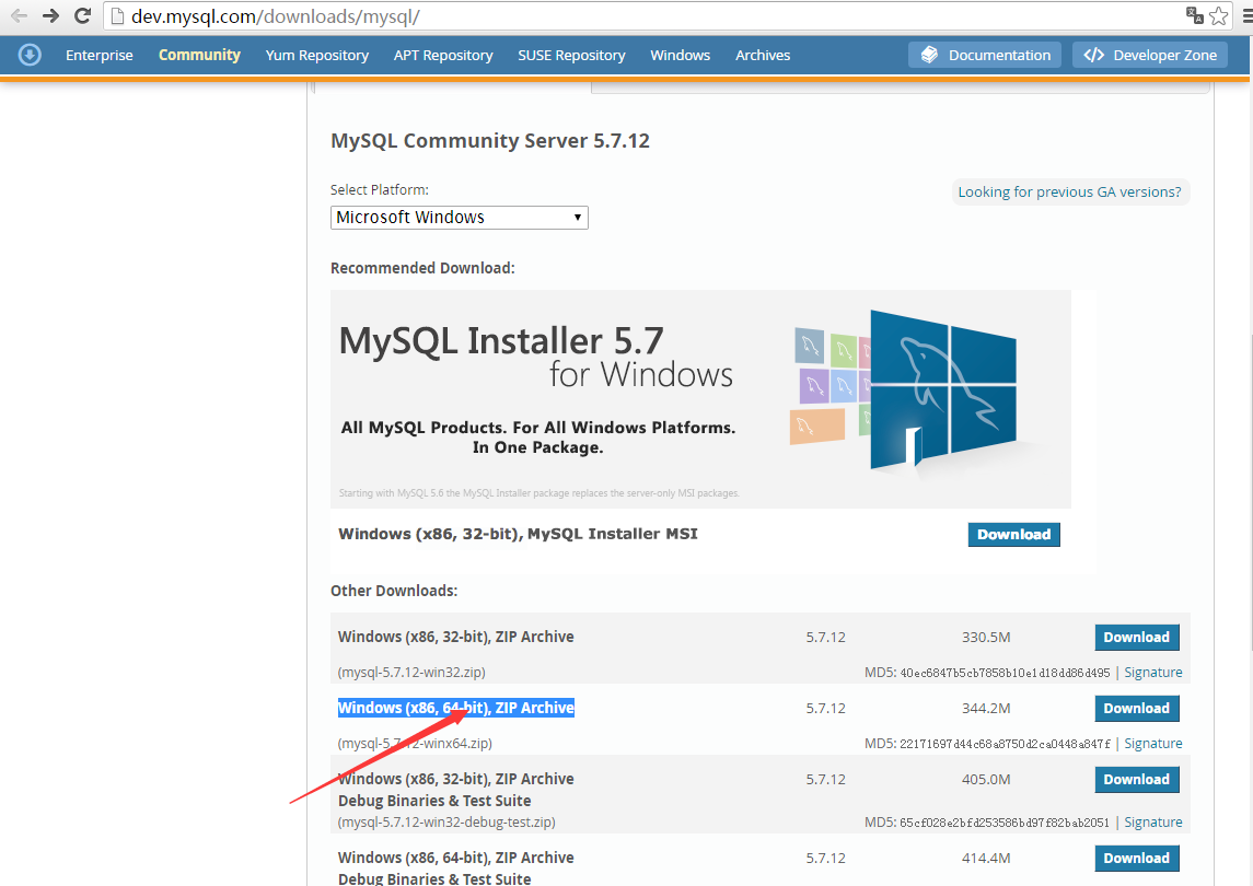 1.工欲善必先利其器,所以第一步要去http://dev.mysql.com/downloads/mysql/下载Windows (x86, 64-bit), ZIP Archive,
