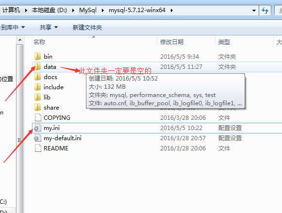 2.下载完成后将其解压到你想要安装的路径下,例如我的解压到D:\MySql\mysql-5.7.12-winx64\路径下,刚解压完应该是下图这些文件夹: