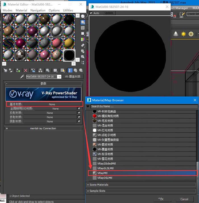1、首先,打开3d max软件,按“M”键调出“材质设置面板”,选择一个空白的材质球。点击“标准”按钮,在弹出的对话框中选择“vray覆盖材质”。