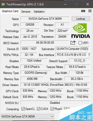 3、然后是显 GTX965 是新版本的GTX965M,GM206核心 规格和桌面GTX960 如出一辙 不过这个频率实在是太保守了。