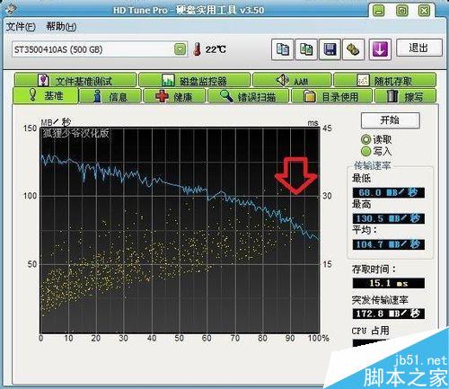 6、从硬盘检测软件的读写速度的测试效果来看,这个曲线一开始基本不变,直到后期斜率降低(效率低了),所以一般的机械硬盘可以将系统盘分在整个硬盘容量的30%左右(读写速度快)。
