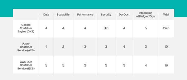 当考虑到安全性时,我们发现Google的服务,通过其Kubernetes容器编排系统,拥有一个“秘密”功能以及一些其他两种服务没有的额外的资源限制。因此,GKE在安全性上得分最高。要记住Microsoft也使用Kubernetes,但是以不同的方式实现。该技术的大部分内容对于用户而言都被抽象了。 但是,当考察托管平台时,或者容器服务运行的公开云平台,很有意思的一点是Google平台,当涉及到安全性时,比AWS或者Azure稍稍落后一点。虽然Google能够和第三方认证访问管理(IAM)工具一起工作,但是它缺少对原生IAM的支持。虽然这一点没有影响上表里的评分,但是这也是决定使用哪种平台时需要考虑的方面。