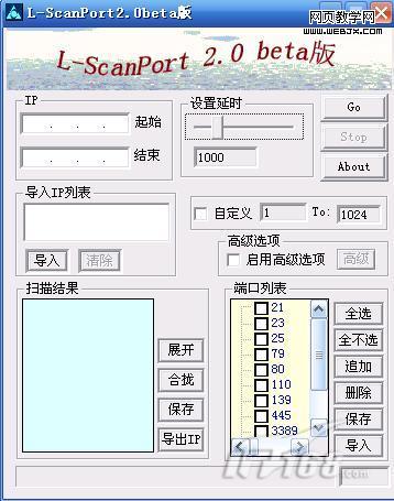 步骤2:打开L-ScanPort端口扫描器(图2),在IP地址一栏中输入想扫描的网络段落,例如“192.168.1.1”作为起始段,“192.168.255.255”作为结束段。然后在软件界面中找到“端口列表”一项,勾选上“445”端口,点击“GO”按钮扫描。