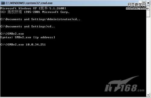 步骤3: 在扮演攻击方的电脑中,我们打开“命令提示符”,将测试程序放在C盘根目录,然后在C :\>根目录下,输入攻击命令:SMBv2.exe [被攻击服务器IP地址](图3)。