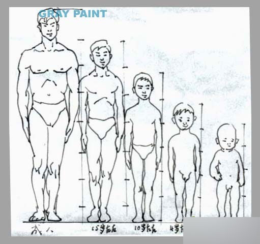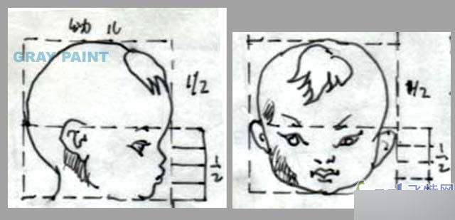 幼儿头部的五官位置和成年人有所区别,其横轴线通过眉毛(成年人通过眼睛),幼儿两眼间距为1.5眼长,成人为1眼长。