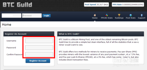 1、首先,我们需要找一个操作方便产出稳定的比特币矿池,然后通过挖矿客户端软件连接到指定的服务器上挖矿。这里以“BTC Guild”网站为例,先打开这个网站,点击左边的用户注册。注册过程比较简单,输入英文用户名,密码和确认密码即可,如图所示