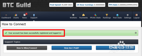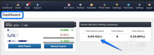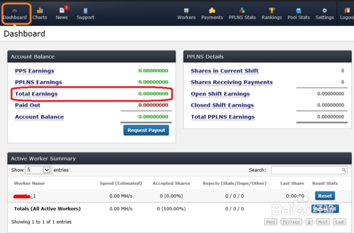 注:在这个监控仪表盘中我们最为关心的是“Total Earnings”,这就是我们当前账户所挣的比特币。以后只要我们打开网站,进入监控仪表盘就可以看到自己账户的相关信息了。