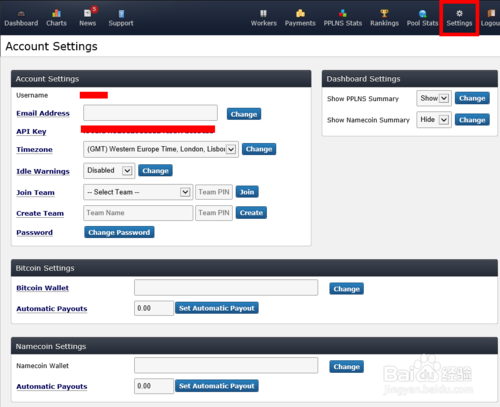 4、接下来请点击页面导航栏中的“Settings”。在设置页面中,我们可以设置电子邮件地,比特钱包地址,更改密码等,如图所示