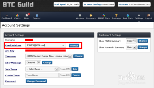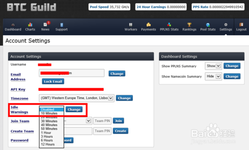 8、如果我们在帐户设置中设置了电子邮件的话,我们还可以对开采矿工的行为设置邮件通知。在设置页面上找到“Idle Warnings”一栏,点击下拉列表,选择想要发送邮件的时间,然后点击右边的“Change”按钮即可。当我们设置10分钟以后,如果有矿工停止开采,系统会在10分钟后自动向我们的邮件发送一封通知邮件。收到邮件以后,我们就知道具体是那个矿工罢工了。
