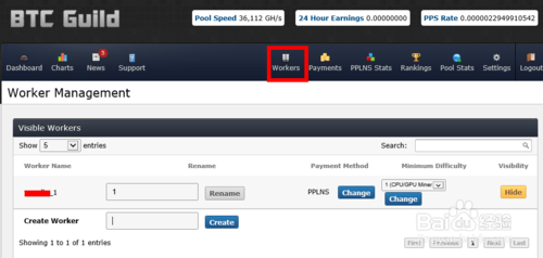 10、帐户设置完成以后,接下来我们要对“Worker”进行设置。什么是 Worker 呢?就是我们之后在比特币开采客户端上要用到的登录矿工帐户名。系统会默认为我们创建一个矿工名,矿工名是以我们注册帐户名加一个下划线和数字组成。比如我们注册的帐户是XXX,那第一个矿工名就叫“XXX_1”,如图所示