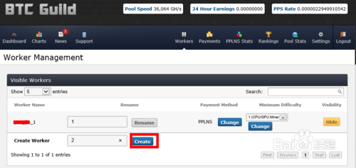 11、如果我们要设置多个矿工名的话,在“Create Worker”一栏中输入一个数字如“2”,再点击“Create”按钮即可添加一个新矿工的帐户名,如图所示