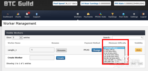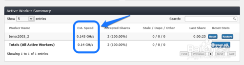 6、除了开采客户端软件上可以看当前开采的速度,我们还可以在 BTC Guild 网站上的 “Dashboard”页面中的“Active Worker Summary”列表中看到每上矿工开采的具体速度,如图所示