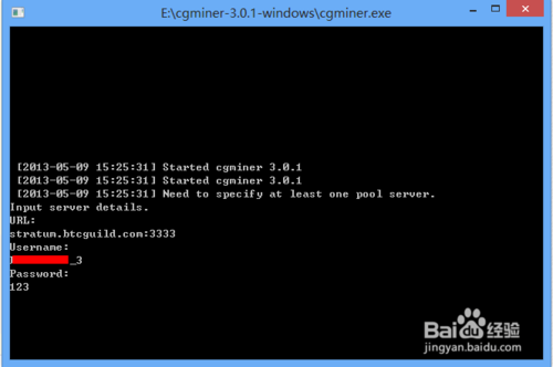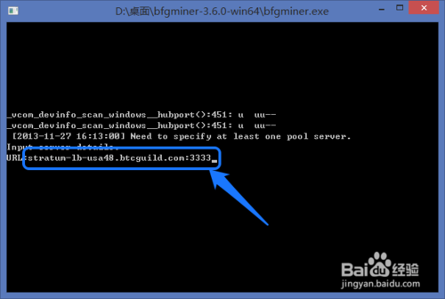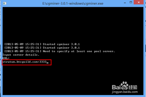 6、用鼠标双击“CGMiner”会弹出一个命令行窗口,提示我们输入连接服务器的 URL 地址。输入“stratum.btcguild.com:3333”,按键盘上的回车键,如图所示