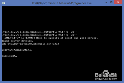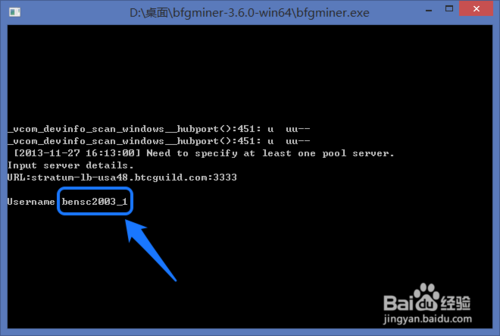 3、然后在 Username 后输入自己先前在 BTC GUILD 网站上设置的矿工名,按回车键,如图所示