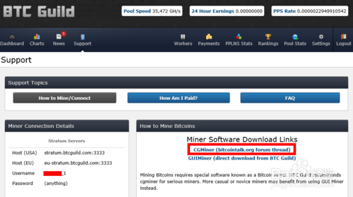 1、如果真要想挖矿的话,官方是推荐我们用“CGMiner”,也就是在命令提示符下运行的。在 BTC Guild 页面上点击“Support”,再点击“CGMiner”下载链接页面,选择对应系统的版本,如图所示