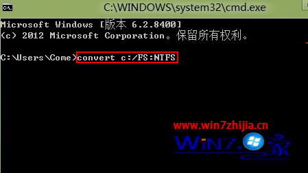 2)将“convert c:/FS:NTFS”复制粘贴到“命令”窗口,然后回车等待自动转换。