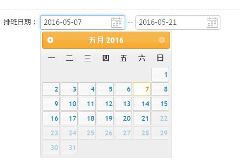 <input class="ipt-datepicker" type="text" id="schduleDateStart" placeholder="排班开始日期.." name="schduleDateStart"> <input class="ipt-datepicker" type="text" id="schduleDateEnd" placeholder="排班结束日期.." name="schduleDateEnd">