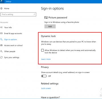 引入动态锁定:动态锁定会自动锁定您的Windows 10 PC,当你不在蓝牙配对手机的可连接范围内。如果您的PC附近找不到与蓝牙配对的手机,则Windows会在30秒后关闭屏幕并锁定PC。 Accounts > Sign-in options and toggle Dynamic lock to "on".'>要启用动态锁定,请确保您的手机已通过蓝牙与您的电脑配对,然后转到设置>帐户>登录选项,然后将动态锁定切换为“开启”。