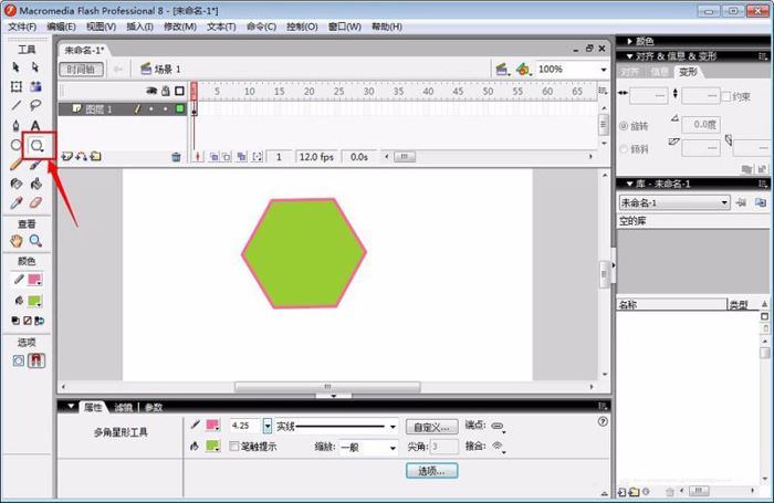 2、如图所示选中“多角形星形工具”,在场景舞台上拖动鼠标画出所示有边框的图形。