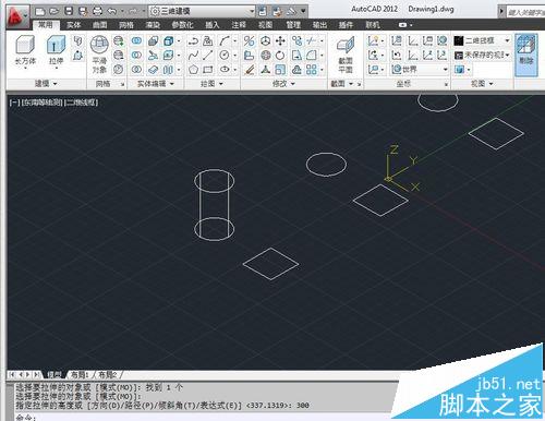 6、按”U“,回车,回车,直到返回拉伸前的状态(每一次回车都会撤销一步操作)。”ext“——选择一个圆和一个矩形,回车——输入300。得到一个圆柱体和一个长方体。输入值为正,向上拉伸,输入为负,向下拉伸。