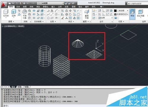 7、”ext“——选择一个圆和一个矩形,回车——”t“(倾斜角)——输入角度如45——输入拉伸高度300。得到一个圆锥体和一个四棱锥。输入值为正,向上拉伸,输入为负,向下拉伸。