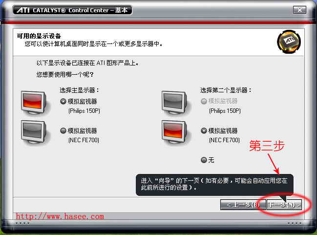 在这里看到已经连接到显卡上的两台显示器,可以设置哪一台为主显示器,哪一台为辅显示器,选好之后单击“下一步”;