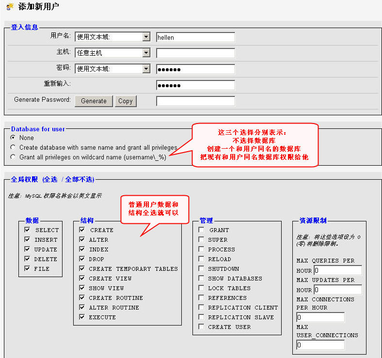 点击“添加新用户”这个连接,添加一个新的数据库用户名