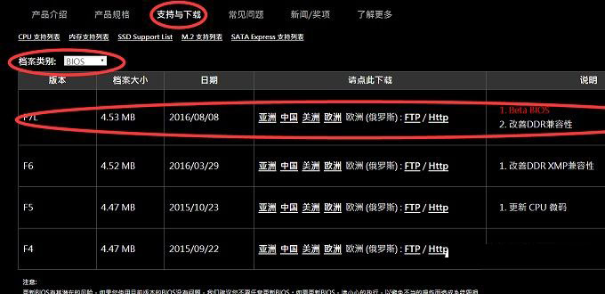 第一步:进入技嘉官网(不知道网址,可以百度搜索),打开官网后,点击上面的“支持”,然后找到自己电脑使用的主板型号对应的新版bios固件,可以直接根据主板型号搜索,如图所示。