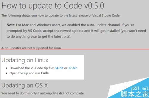 5、在接下来的页面,我们点击 Updating on Linux 一节里的链接,开始下载。有两个链接,分别是 64 位的和 32 位的,根据自己的情况选择。