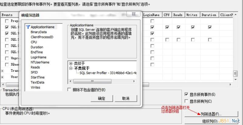 | ApplicationName(应用程序名称) | Not like:SQL Profiler | 过滤Profiler生成的事件。这是默认的行为 |
