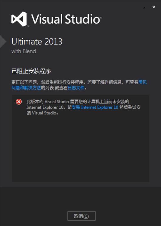 VS就会告诉我们目前环境不适合安装VS2013,必须升级IE版本到IE10.