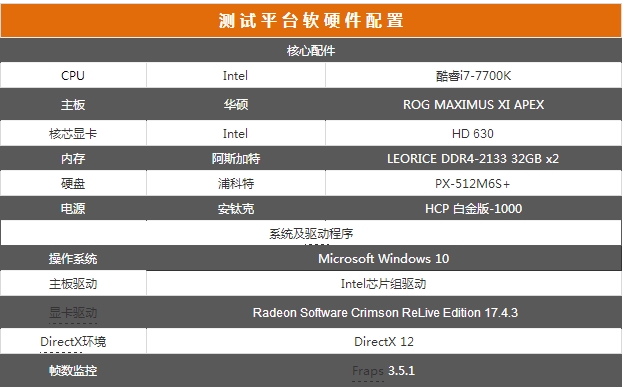 为保证测试能够发挥显卡的最佳性能,本次测试平台采用全新7代酷睿芯——Intel酷睿i7-7700K处理器、华硕Z270芯片组主板、阿斯加特DDR4-2133 32GB双通道内存、安钛克1000w钛金电源组建而成。详细硬件规格如下表所示: