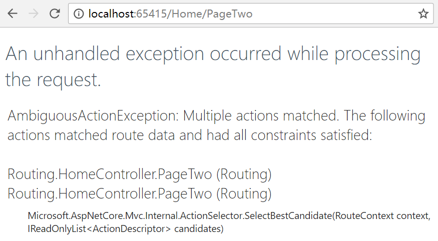 在浏览器地址栏敲入:http://localhost:65415/Home/PageTwo,观看到异常页面: