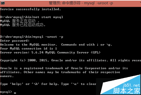 6、启动服务:输入net start mysql并回车;
