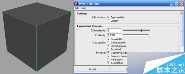 第一步:在一个新场景里建立一个cube(立方体),到Smooth(光滑)选项,将细分级别调整到3.