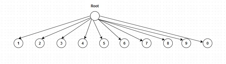 Trie树通常又称为字典树、单词查找树或前缀树,是一种用于快速检索的多叉树结构。如图数字的字典是一个10叉树: