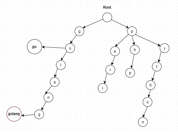 Node包含三个成员变量。c为每个节点上存储的字符。word表示一个完整的词,在本文中指的是一个字符串。childs包含这个节点的所有子节点。既然在每个节点中存储了c,那么存储word有什么用呢?并且这个word应该存在哪个节点上呢?还是用刚才的图举例子:比如go和golang,它们共用go前缀,如果是字符串搜索倒好办,因为会提供原始字符串,只要在这棵Trie树上按照路径搜索即可。但是对于排序来说,不会提供任何输入,所以无法知道单词的边界在哪里,而Node类中的word就是起到单词边界作用。具体是存储在单词的最后一个节点上,如图所示: