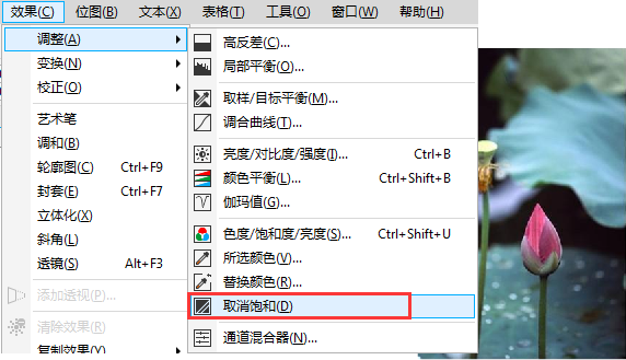 2、执行"效果>调整>取消饱和"去除图片颜色,