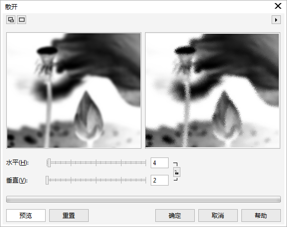 6、再执行"位图>创造性>散开"。水平数值4,垂直数值2,到这一步,水墨画的效果已经出来了。