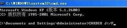 3.在dos对话框键入chkdsk j:/f回车键(注:J代表你要处理盘符,这里我要处理的是J盘)。