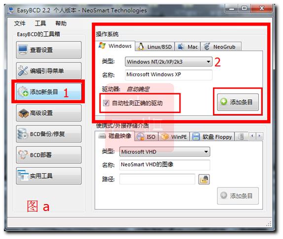 点击左边“添加新条目”,选择右边操作系统下的类型为“windows NT/2K/XP/2K3"名称可以自己修改(忘记修改也没事,下面还介绍怎样修改的)。可以选择“自动检测正确的驱动”在前面打勾如图a ;也可以自己选择驱动器(XP系统所在的盘符)如图b。