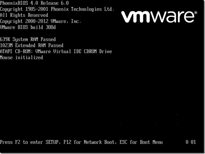 在VMware里面如何进入BIOS是个头疼的问题,因为启动界面一闪而过(下面两个图如果不设置bios.bootDelay,基本上很难抓到),即使你狂按F2或ESC键(ESC: 调整启动顺序;F2: 进入BIOS Setup) ,绝大部分都无法进入BIOS。因为VMware启动界面显示时间太短、系统无法识别按键而直接开启了系统。