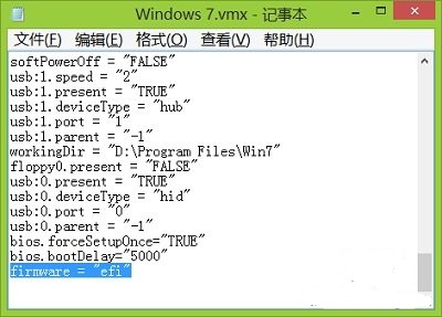 第一步、新建虚拟机,在虚拟机工作目录下找到.vmx格式文件,使用记事本程序,打开该文件,在文件中添加:firmware = "efi"