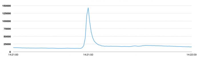 下图是峰值发生的邻近时间段的访问频率图,Twitter通常每天的推文数是 5 亿条,平均下来每秒大概产生5700条。这个峰值大概是稳定状态下访问量的25倍!