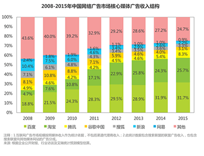 2015年,互联网广告市场相对集中在一些巨头手中,其中霸占头把交椅的百度,占比31.7%较往年初现颓势,而腾讯在沉寂了数年之后,突然如梦初醒,得益于微信广告方面的突破,较14年增长了百分之60%,实现了爆发式的增长。