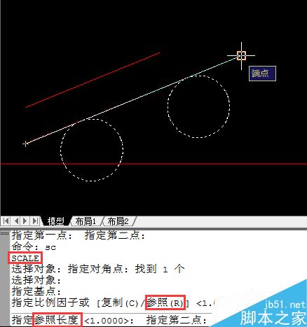 1、命令行输入sc(命令全名scale),选择图块对象,指定块中直线的左端点为基点(也可选择其他点,这里为方便选择此点),要求比例因子时键入R(参照选项),点取块中直线的两个端点获取参照长度。