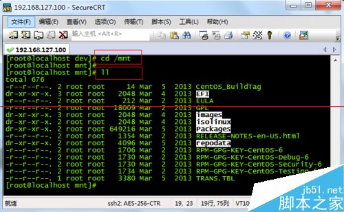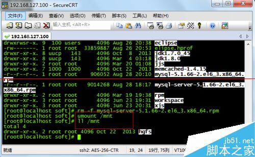 6、使用完毕以后,要记得卸载光盘。在命令行输入:umount /mnt。然后再进入/mnt目录就看不到光盘的内容了,说明已经成功卸载。