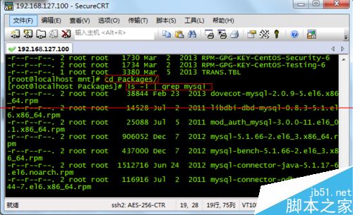 4、进入到Packages目录,在命令行输入:cd Packages。然后输入:ls -l | grep mysql。找到我们要拷贝出来的rpm包。